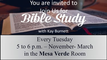 Bible Study classes are held during the months of November through March, in the Mesa Verde Room (2615 S. Farnsworth Drive), every Tuesday evening from 5 to 6 p.m.